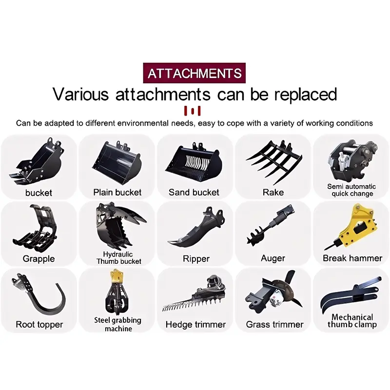 Έχουμε παράγει διαφορετικά συνημμένα που αντιστοιχούν σε διάφορα μοντέλα για μίνι εκσκαφείς. Διευκολύνοντας τους χρήστες να ολοκληρώσουν διαφορετικές εργασίες σε διάφορα σενάρια χρήσης. Πραγματικά επιτυγχάνοντας ένα μηχάνημα για πολλαπλούς σκοπούς, χρησιμοποιώντας στοχευμένα συνημμένα για να ολοκληρώσετε συγκεκριμένες εργασίες.